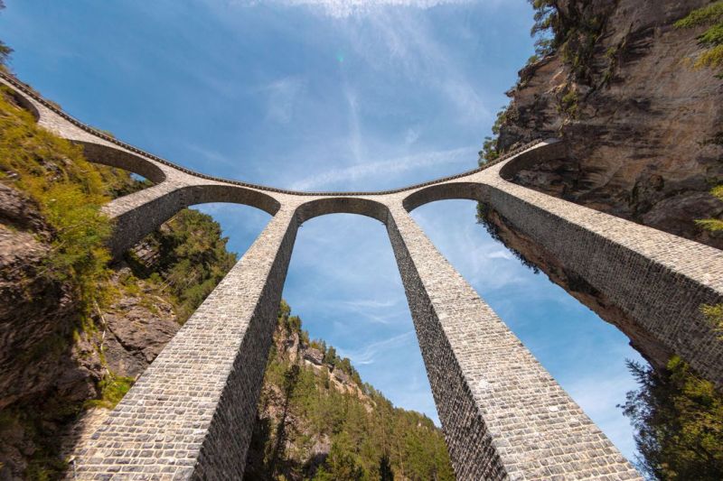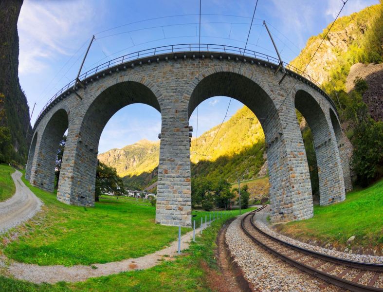 Zaljubljenici u mostove zapamtiće vijadukt Landwasser, visok 65 metara i izgrađen od kamena, koji u oštrom zavoju preko netaknute doline Landwasser ulazi pravo u tunel, kao i vijadukt Solis koji je izgrađen 1902., a nalazi se na 89 metara visine i ima raspon od 42 metra, ali kružni vijadukt Brusio možda je ipak, zbog svog oblika, najupečatljiviji od svih.